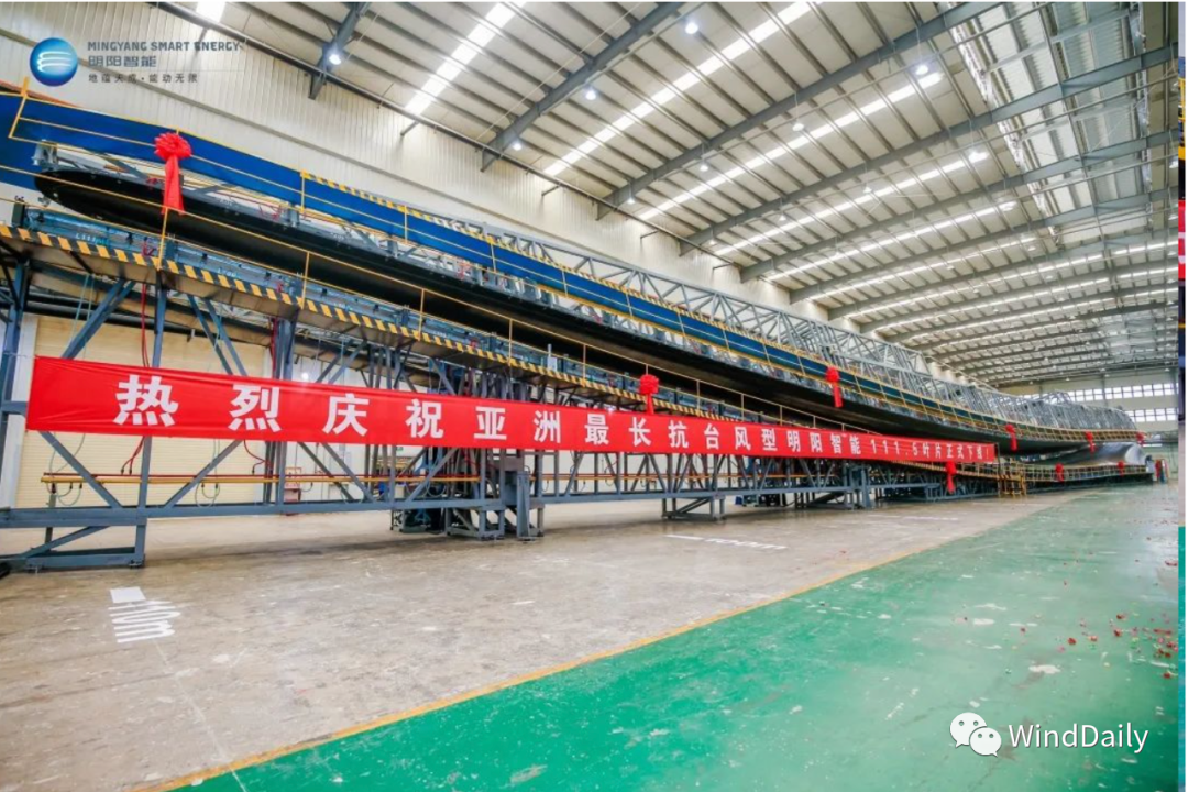 深藍(lán)新翼,御風(fēng)而行。6月23日,明陽智能111.5葉片下線儀式在廣東陽江舉行,這是明陽智能針對海上平價項目需求自主研發(fā)設(shè)計和制造,適用于超I類風(fēng)區(qū)的亞洲最長的抗臺風(fēng)型海上葉片。