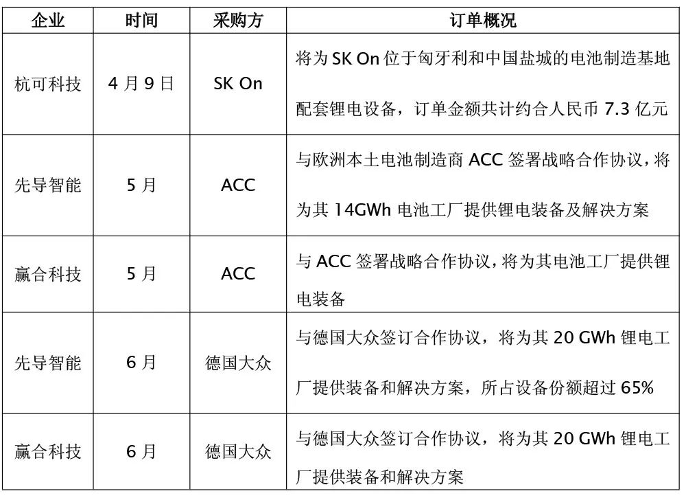 實際上,今年以來,國內鋰電裝備頭部企業已經相繼拿下海外大規模鋰電裝備訂單。