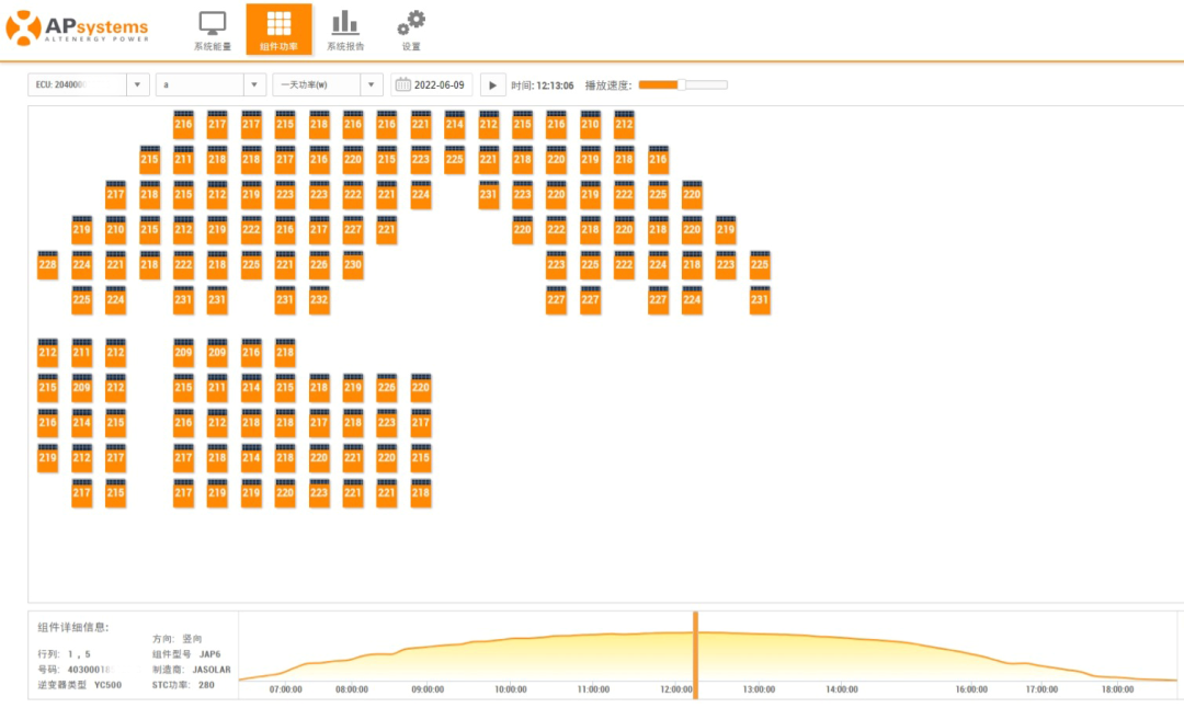 考慮到分布式光伏項目“小而散”,運維成本較高,難度較大,組件故障定位尤其不易,昱能科技創(chuàng)新性地實現(xiàn)了組件級監(jiān)控,讓遠程監(jiān)控、運維成為可能。通過后方監(jiān)控平臺,我們可以清楚的看到每一塊組件的發(fā)電情況,了解其電壓、電流、功率等信息。當光伏電站出現(xiàn)故障時,可以精準定位,甚至不需要排工程人員到現(xiàn)場,就可以通過后臺進行遠程診斷,快速排查解決問題,盡可能減少因電站故障停電而對加油站正常運作帶來的影響。“只要在有網(wǎng)絡(luò)的情況下,用戶可以通過電腦或者智能手機登錄EMA,也可以通過手機應(yīng)用APP實時監(jiān)控系統(tǒng)中每一塊組件的運行情況,實現(xiàn)故障快速定位。”