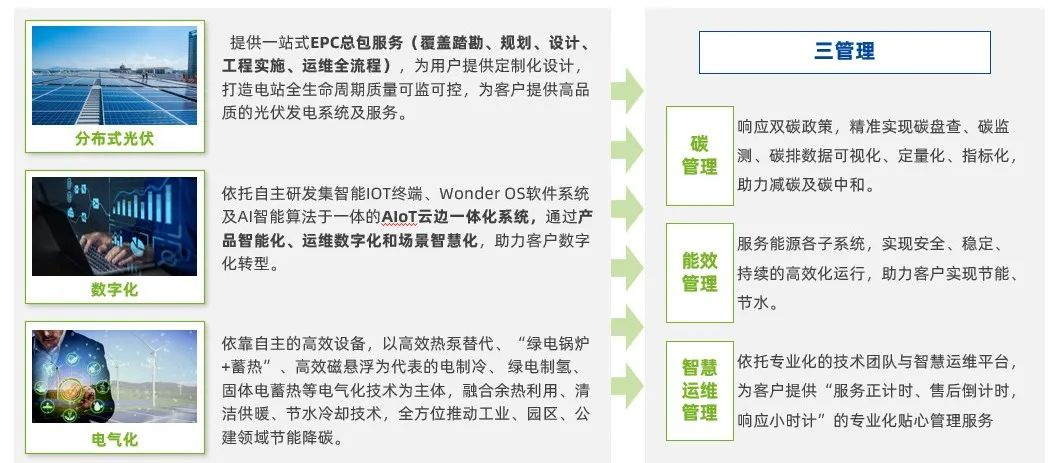 雙良智慧能源于今年正式成立光伏+事業部,并結合“供能端零碳技術”和“用能端減碳技術”的技術路線,整合自身傳統業務優勢,提出"一光兩化三管理"的光伏+綜合解決方案,即分布式光伏電站一站式 EPC 總包服務+數字化+電氣化,并在數據終端實現碳管理、能效管理、智慧運維管理,助力客戶降低能源費用、提高能源保障能力、降低碳排放及助力綠色示范創建。