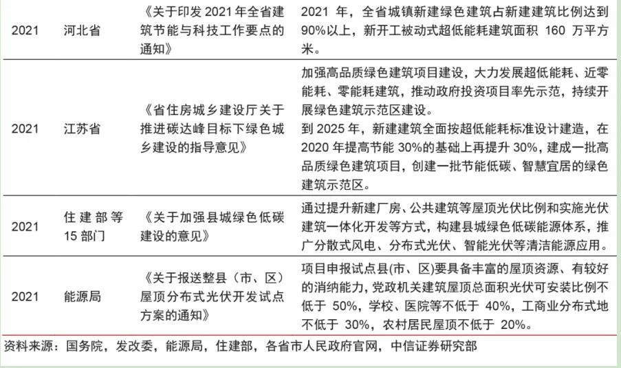 2020年9月,我國提出“碳達峰”、“碳中和”的愿景目標,其中發展綠色建筑成為實現減碳目標的重要手段,BIPV也迎來了市場爆發的前夜。目前,我國及各省市十四五規劃綱要多提及BIPV相關內容,為其帶來發展新機遇。如下表,這是近年BIPV/光電建筑的相關政策: