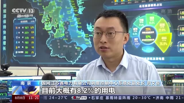 國網江蘇省電力有限公司調度控制中心系統處副處長 周文俊:截止到現在風電發電量同比增長已經達到了28.6%,大概有8.2%的用電是由風力發電所提供。