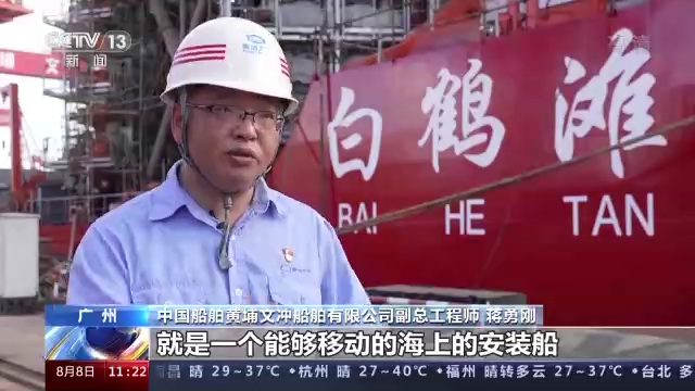 中國船舶黃埔文沖船舶有限公司副總工程師 蔣勇剛:自升式風電安裝平臺,就是一個能夠移動的海上安裝船,隨著風電風機的功率加大,重量、高度都在往上增長,所以我們跟隨這個趨勢建造了一系列的裝備。像我們目前建造的這個平臺,它能夠適應70米的工作水深。