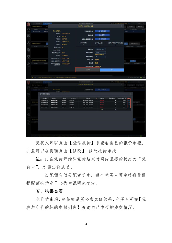 競(jìng)買人在競(jìng)價(jià)時(shí)間內(nèi)可進(jìn)行多次申報(bào),總申報(bào)量為各次申報(bào)的總量,總申報(bào)量不得超過競(jìng)買人允許的最大申報(bào)數(shù)量。競(jìng)價(jià)申報(bào)單允許向上修改報(bào)價(jià)和數(shù)量,不允許撤銷、向下修改報(bào)價(jià)或數(shù)量。