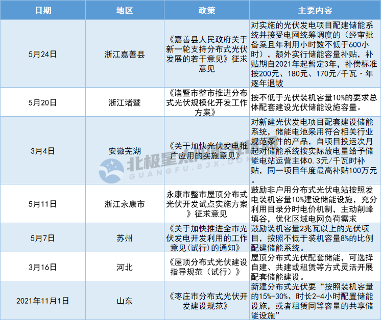 而非戶用分布式光伏電站,配置儲能的要求則快速擴(kuò)大。此前,據(jù)北極星統(tǒng)計,截至5月底,已有山東、河北、江蘇、安徽、浙江等多地出臺或鼓勵或強(qiáng)制分布式光伏配置儲能的政策要求。