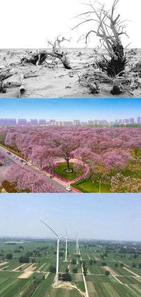 走進(jìn)蘭考縣,50多年前焦裕祿親手種下的泡桐樹,如今已枝繁葉茂、綠樹成蔭;50多年后,豫東平原上豎起的“新泡桐”化風(fēng)為電,再度帶來綠色發(fā)展新希望。綠樹成蔭、風(fēng)車輪轉(zhuǎn),勤勞的人們讀懂自然的語言,善用自然的力量,創(chuàng)造一片片綠水青山。