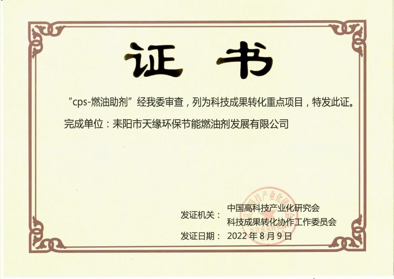 CPS-燃油助劑發(fā)明和創(chuàng)造了低碳石油,解決了常規(guī)石油尾氣排放問題,開了低碳石油技術(shù)的歷史先河,從根本上可以解決因石油尾氣排放因素所造成的空氣污染,是治理霧霾、緩解氣候變化現(xiàn)象的一項最直接、最有效的技術(shù),是發(fā)展低碳經(jīng)濟、實行節(jié)能減排國家規(guī)劃綱要,是維護中華民族長遠利益的必然要求。技術(shù)于2003年9月9日通過省科技成果鑒定,該項技術(shù)的成功出現(xiàn),為我國稠油加工多功能高效助劑領(lǐng)域的空白增添了一筆色彩,該技術(shù)在國內(nèi)燃油助劑研究領(lǐng)域處于領(lǐng)先水平。同年12月又通過了省高科技產(chǎn)品(項目)認定,榮獲2003年省新技術(shù)新產(chǎn)品創(chuàng)新金獎,2004年衡陽市科技進步一等獎,省科技進步三等獎。CPS-燃油助劑項目更是被授予“省科技成果重點推廣計劃項目”。2011年10月21日該技術(shù)再次通過了國家科技成果鑒定。2016年5月15日完成科學(xué)技術(shù)評價,中高科評字[2016]第003號,2022年8月列入“科技成果轉(zhuǎn)化重點項目”。該項目技術(shù)經(jīng)過專家多次的評審分析和可行性研究,技術(shù)成熟,產(chǎn)品市場潛力巨大,經(jīng)濟社會效益明顯,是一項節(jié)能減排的重大科技成果項目。它發(fā)明和創(chuàng)造了清潔低碳石油,為人類造福,還人類一個美好的清新自然的生活環(huán)境,是實現(xiàn)低碳石油應(yīng)用最有效的一項科學(xué)技術(shù)。