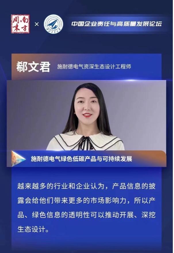 近日,施耐德電氣資深生態(tài)設(shè)計(jì)工程師郗文君在2022中國(guó)企業(yè)責(zé)任與高質(zhì)量發(fā)展論壇上,圍繞綠色低碳產(chǎn)品與可持續(xù)發(fā)展話(huà)題發(fā)表演講。郗文君認(rèn)為:“產(chǎn)品環(huán)境信息透明性有助于擴(kuò)大企業(yè)市場(chǎng)競(jìng)爭(zhēng)力,是深挖生態(tài)設(shè)計(jì)的重要驅(qū)動(dòng)力。”