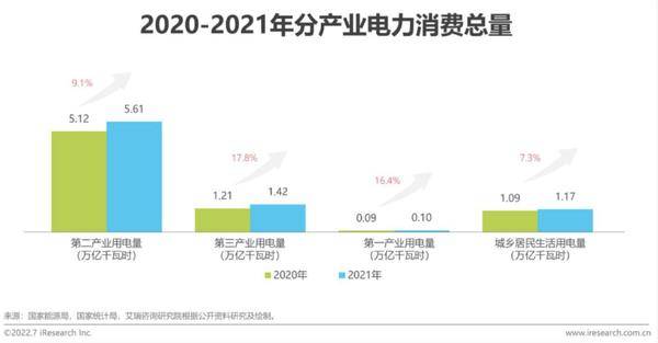 首先,根據艾瑞咨詢《2022年中國電力產業數字化研究報告》,2021年,我國全社會用電量達83129億千瓦時,同比增長10.5%。分產業看,受數字經濟發展影響,以第三產業為首的新興領域用電需求陡增(如充換電服務業),2021年第三產業用電量同比增長17.8%。然而電力生產增速放緩,2021年全社會用電量超出發電量約0.2萬億千瓦時。