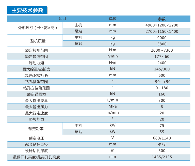5、鉆機打鉆機構具有全方位鉆孔功能,開孔水平角度0~180°,仰俯角度±90°,開孔范圍廣,適應能力強;