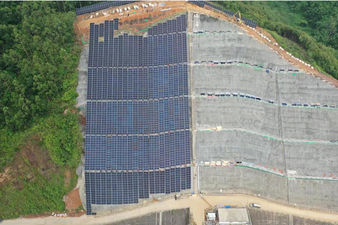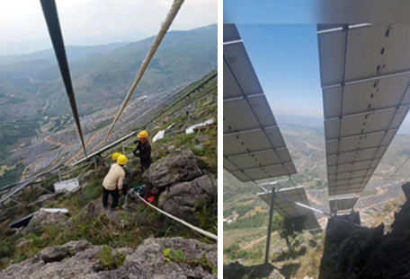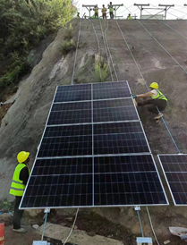 此地形復雜(不規則陡坡35-45度),聚光新能源通過多次項目實地勘察,從測量、排布到方案設計等因地制宜制定出了科學、嚴謹、有效的柔性支架方案,聚光新能源專利柔性支架技術具有減少占地資源、加大空間利用、減少鋼材用量、節約施工成本等特點,最大限度地保證了空置山體有效利用率,提高發電總量,在項目技術設計方案、施工安全、效率等方面贏得客戶方高度認可。