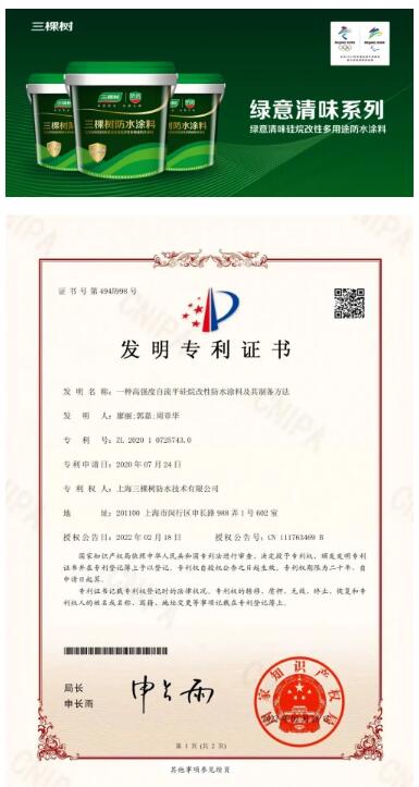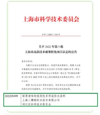 10月28日,經過多方專家評審,三棵樹防水SGW9000硅烷改性多用途防水涂料榮獲《2022年第5批上海市高新技術成果轉化項目認定》。
