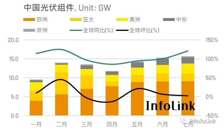 7月組件出口量15.7GW再創新高,同比增長121%。但每月環比增速從5月開始已逐漸下降,據PVInfoLink數據顯示,7月環比增長3%,代表中國組件單月出口量已接近今年高峰值。