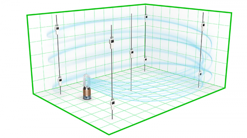 相比于傳統測試,戴森工程師精益求精,在更接近平均居住空間的一個81立方米的實驗室內開展POLAR測試。在不安裝附加混流風扇的情況下,將空氣凈化設備放置在一角,并采用9個傳感器持續監測整屋的空氣質量數據,評估空氣凈化設備的過濾表現、傳感性能以及整屋均勻凈化效果。這一測試能夠全面、有效地保障真實家庭環境中整屋空氣質量的潔凈與健康。