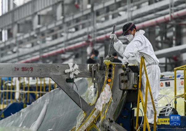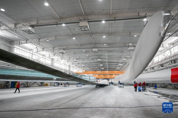 2月9日,在內蒙古烏蘭察布市遠景北方能源有限公司,工人在風機葉片生產線上工作。