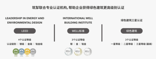 綠色建筑意味著更低的耗能和更高的生活品質(zhì)。在全球范圍內(nèi),綠色建筑認(rèn)證在推動(dòng)綠色建筑發(fā)展方面起到了突出的作用,獲得了各國(guó)的認(rèn)可。筑掣科技聯(lián)合專業(yè)認(rèn)證機(jī)構(gòu)幫助企業(yè)獲得更高級(jí)別的綠色建筑認(rèn)證,具體包含美國(guó)LEED、國(guó)際WELL標(biāo)準(zhǔn)以及中國(guó)綠色建筑三星認(rèn)證。