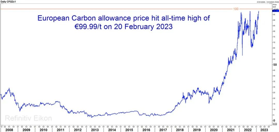 路透社報道, 2月20日歐洲基準碳排放合同創下歷史新高,2023年12月歐盟配額(EUA)基準合約收于每噸98.30歐元,自周五收盤以來上漲2.1%,此前曾觸及每噸99.99歐元的歷史新高。