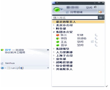 企業通訊錄業務支持根據企業的組織結構進行人員分組,支持用戶的狀態顯示,包括:在線、離線、忙碌、隱身、離開等狀態。支持以輸入人名或者ID的方式進行快速查找。通過企業通訊錄界面,用戶可以向其他用戶發起即時消息或者音、視頻會議等業務。