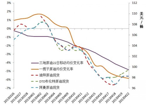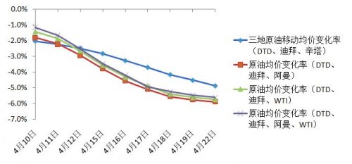 按照新機制,模擬計算一攬子油價變化率,和舊機制的三地原油移動均價變化率對比,可以看出:新機制下參考指標的走勢與國際油價更加契合,與原油聯動性大大加強。從下圖可以看出,三地(DTD、迪拜、辛塔)原油22日移動均價變化率4月22日為-4.86%,低于新華社石油價格系統發布的一攬子原油均價變化率;與DTD、阿曼、迪拜三種原油價格相比,三地率曲線走勢明顯更平緩,對原油價格變化的敏感度比一攬子原油均價變化率要低。
