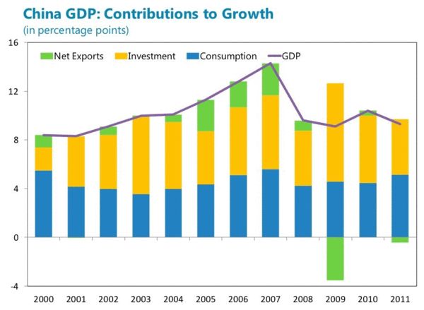 中國投資為主的增長模式是造成產能過剩的主要原因,由IMF發布的圖表顯示了2000年以來投資與GDP增長的關系: