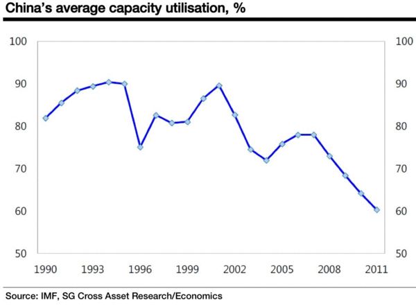中國的平均資本利用率從2007年底的80%下降至了2011年的60%