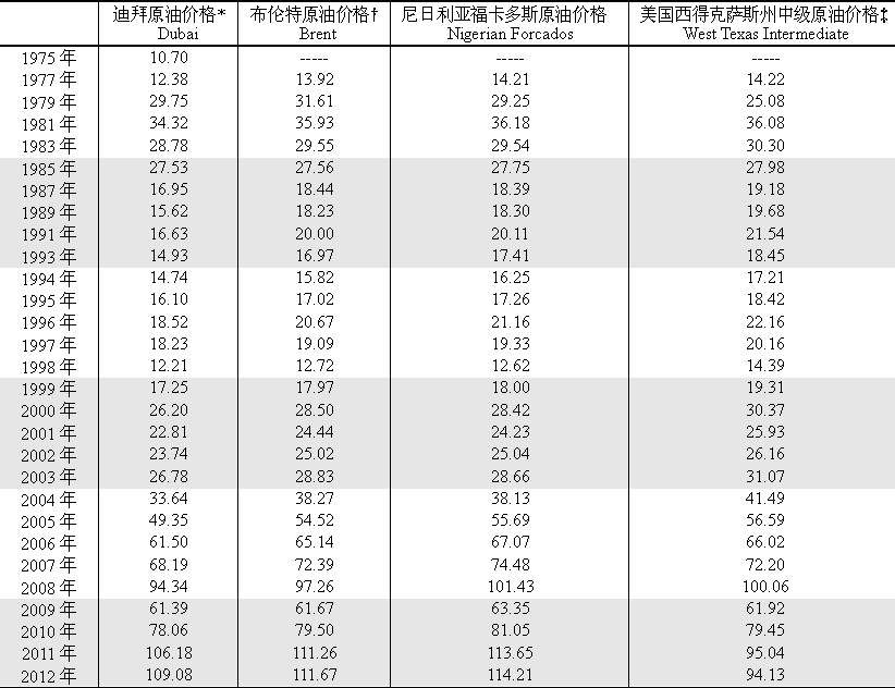 ‡1976-1983年公布的美國西得克薩斯州中級原油價格。1984-2012年美國西得克薩斯州中級原油(庫欣)現(xiàn)貨價格。