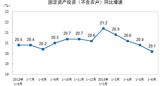 2013年1-6月份,全國固定資產投資(不含農戶)181318億元,同比名義增長20.1%(扣除價格因素實際增長20.1%),增速比1-5月份回落0.3個百分點。從環比看,6月份固定資產投資(不含農戶)增長1.51%。