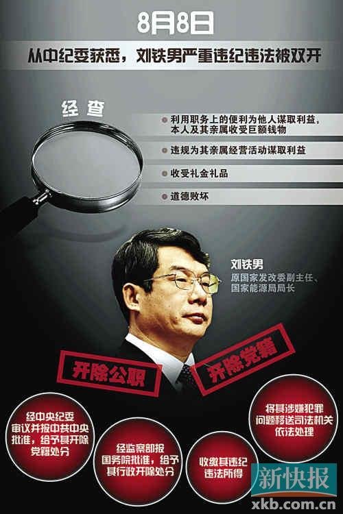 經查,劉鐵男利用職務上的便利為他人謀取利益,本人及其親屬收受巨額錢物;違規為其親屬經營活動謀取利益;收受禮金禮品;道德敗壞。劉鐵男的上述行為已構成嚴重違紀違法,其中有的問題已涉嫌犯罪。依據《中國共產黨紀律處分條例》、《行政機關公務員處分條例》的有關規定,經中央紀委審議并報中共中央批準,決定給予劉鐵男開除黨籍處分;經監察部報國務院批準,決定給予其行政開除處分;收繳其違紀違法所得;將其涉嫌犯罪問題移送司法機關依法處理。