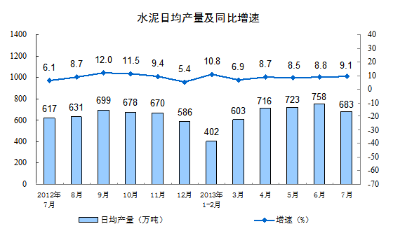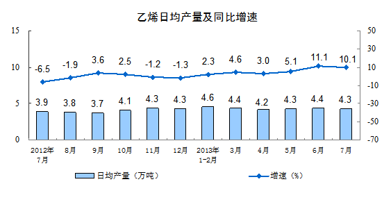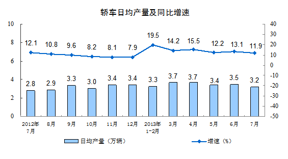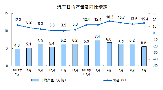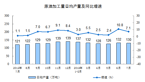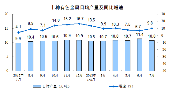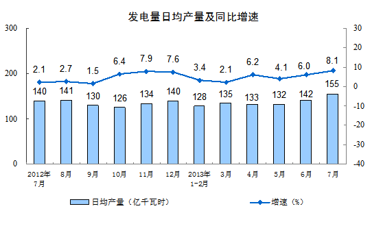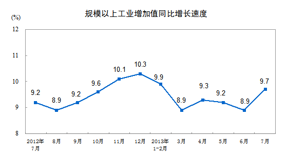 2013年7月份,規模以上工業增加值同比實際增長9.7 %(以下增加值增速均為扣除價格因素的實際增長率),比6月份加快0.8個百分點。從環比看,7月份,規模以上工業增加值比上月增長0.88%。1-7月,規模以上工業增加值同比增長9.4%。