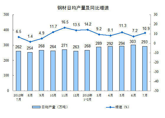 分產品看,7月份,464種產品中有306種產品同比增長。其中,發電量4795億千瓦時,同比增長8.1%;鋼材9075萬噸,增長10.9%;水泥21182萬噸,增長9.1%;原油加工量4030萬噸,增長7.1%;十種有色金屬335萬噸,增長9.8%;乙烯132萬噸,增長10.1%;汽車170.8萬輛,增長15.4%;轎車98.5萬輛,增長11.9%。