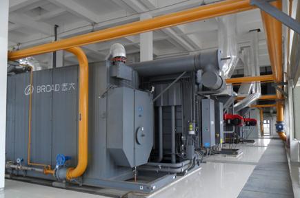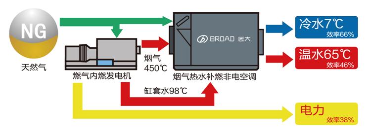 發(fā)電機(jī)向建筑送電,非電空調(diào)用煙氣熱水制冷制熱,不發(fā)電時(shí)用天然氣補(bǔ)燃。系統(tǒng)包含4臺內(nèi)燃機(jī),4臺煙氣熱水補(bǔ)燃型非電空調(diào)設(shè)備,和3臺直燃型非電空調(diào)設(shè)備,發(fā)電量為4640kW,發(fā)電效率為39%,制冷量為4500*10^4kcal/h,每年節(jié)約的能源約為2400噸標(biāo)煤,每年為節(jié)能減排事業(yè)貢獻(xiàn)7032噸的二氧化碳減排量。