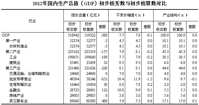國(guó)家統(tǒng)計(jì)局昨日發(fā)布公告,經(jīng)初步核實(shí),2012年我國(guó)國(guó)內(nèi)生產(chǎn)總值(GDP)現(xiàn)價(jià)總量為518942億元,比初步核算數(shù)減少380億元;按不變價(jià)格計(jì)算的增長(zhǎng)速度為7.7%,比初步核算數(shù)降低0.1個(gè)百分點(diǎn)。