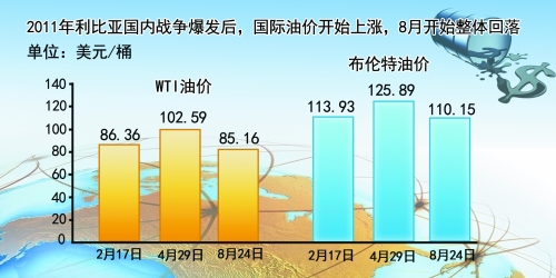 利比亞國內(nèi)戰(zhàn)爭2011年爆發(fā)后,國際油價開始上漲,并于4月底達(dá)到高點(diǎn)。5月5日,油價大跌10美元/桶左右,隨后維持震蕩走勢。2011年8月,油價開始整體回落。