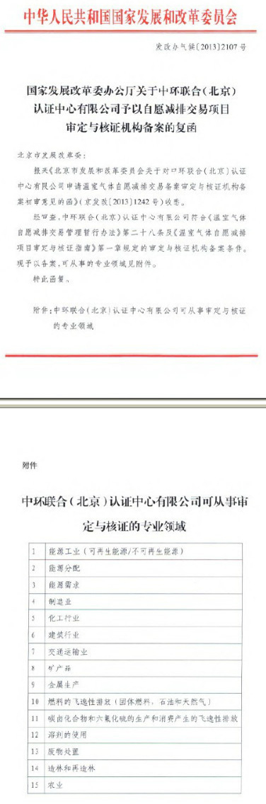 根據《溫室氣體自愿減排交易管理暫行辦法》要求,經審核,中環聯合(北京)認證中心有限公司符合《溫室氣體自愿減排交易管理暫行辦法》和《溫室氣體自愿減排項目審定與核證指南》規定的備案條件,已予以備案。
