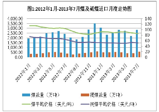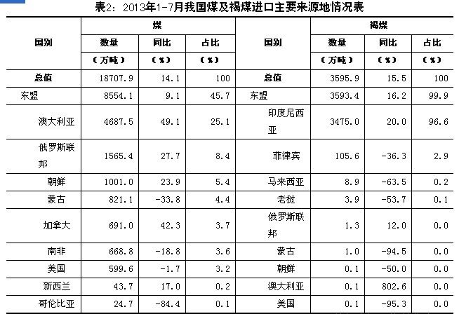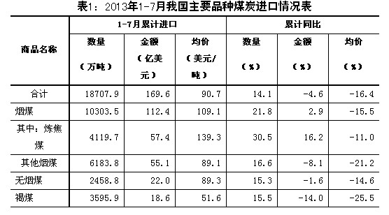 據海關信息網統計,今年1-7月,我國進口煤1.9億噸,增加14.1%;價值169.6億美元,下降4.6%;進口平均價格為每噸90.7美元,下跌16.4%。