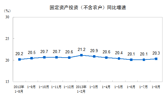 2013年1-8月份,全國固定資產(chǎn)投資(不含農(nóng)戶)262578億元,同比名義增長20.3%,增速比1-7月份加快0.2個百分點。從環(huán)比看,8月份固定資產(chǎn)投資(不含農(nóng)戶)增長1.61%。