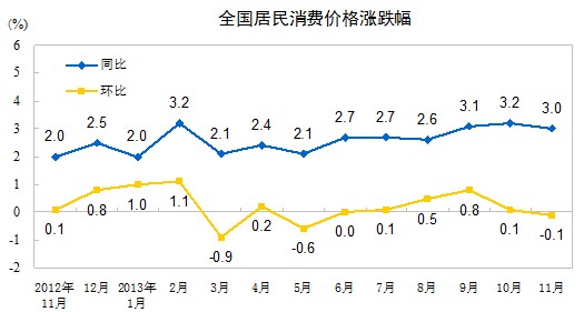 2013年11月份,全國居民消費(fèi)價格總水平同比上漲3.0%。其中,城市上漲3.0%,農(nóng)村上漲3.1%;食品價格上漲5.9%,非食品價格上漲1.6%;消費(fèi)品價格上漲2.9%,服務(wù)價格上漲3.3%。1-11月平均,全國居民消費(fèi)價格總水平比去年同期上漲2.6%。