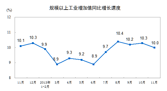 2013年11月份,規模以上工業增加值同比實際增長10.0 %(以下增加值增速均為扣除價格因素的實際增長率),比10月份回落0.3個百分點;從環比看,11月份比上月增長0.76%。1-11月,規模以上工業增加值同比增長9.7%。