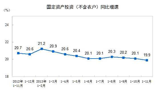 2013年1-11月份,全國固定資產投資(不含農戶)391283億元,同比名義增長19.9%,增速比1-10月份回落0.2個百分點。從環比看,11月份固定資產投資(不含農戶)增長1.47%。