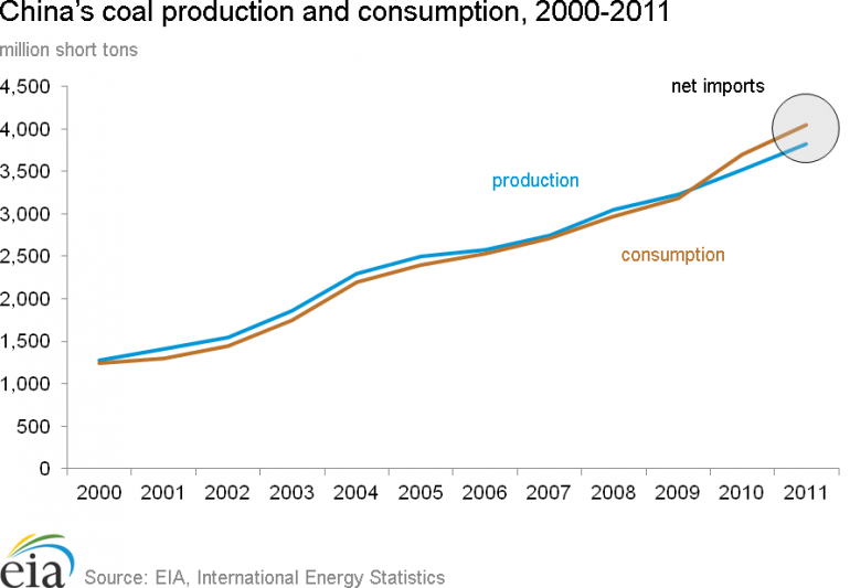 2000年中國(guó)煤炭生產(chǎn)及消費(fèi)趨勢(shì)圖。來(lái)源:EIA