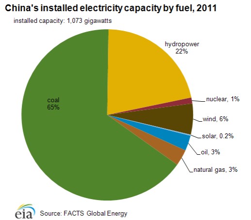 2011年中國(guó)各種資源發(fā)電裝機(jī)量比率圖。來(lái)源:EIA