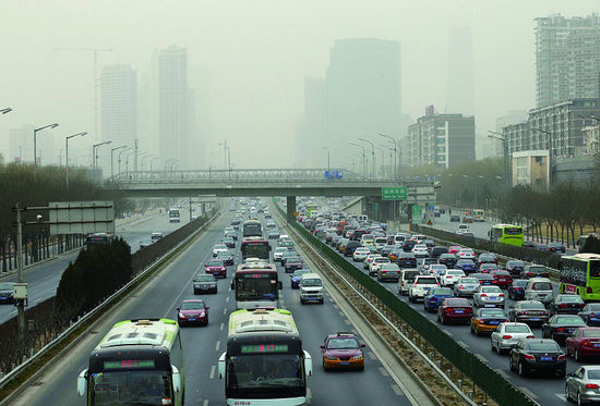 上午,從四惠橋往西看,京通快速上空彌漫著黃色的塵土
