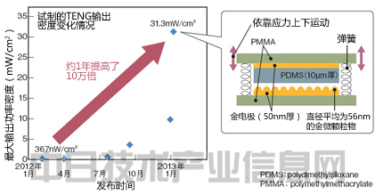 TENG為摩擦取電技術,也就是使兩種材料接觸或摩擦產生靜電,然后流過整流電路,作為直流電力提取。2012年1月第一次發布時,輸出密度還非常低,最大只有367nW/cm2。在1年后的2013年1月發布時,最大輸出密度提高到31.3mW/cm2,為最初的約10萬倍(圖1)。王中林介紹說,輸出密度的提高主要得益于“對材料之間的接觸面進行了微細加工,大幅增加了表面積”。