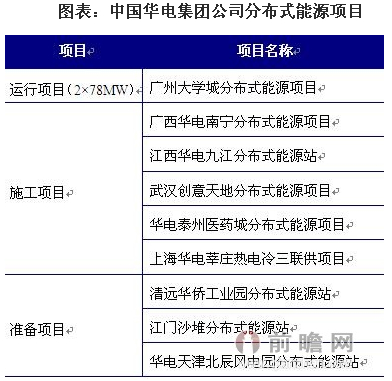 前瞻網分布式能源研究報告顯示,國內從事分布式能源投資的發(fā)電集團主要是我國的五大發(fā)電集團,即中國華能集團公司、中國大唐集團公司、中國華電集團公司、中國國電集團公司、中國電力投資集團公司。其中,華電集團是我國天然氣分布式能源項目起步最早,開發(fā)項目最多的發(fā)電企業(yè),同時,公司還積極發(fā)展風電、太陽能發(fā)電、生物質發(fā)電、小水電等其它類型的分布式能源。華電集團已取得天津、上海、廣東等十幾個省區(qū)近100萬千瓦分布式能源核準批復,占全國的三分之二。其典型項目如下: