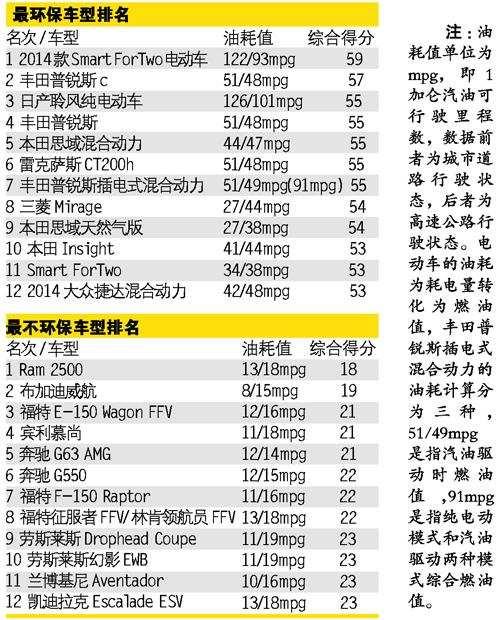 近日,福布斯網(wǎng)站發(fā)布了2014年度最環(huán)保車(chē)型的榜單,與此同時(shí),“最不環(huán)保車(chē)型”榜單也應(yīng)聲出爐。據(jù)悉,此次排名的根據(jù)是來(lái)自于美國(guó)能源有效經(jīng)濟(jì)利用理事會(huì)(ACEEE)最近的評(píng)分結(jié)果,該機(jī)構(gòu)的評(píng)分依據(jù)單車(chē)的燃油耗值及尾氣排放值兩大因素,綜合評(píng)分越高越好,得分越低則說(shuō)明越不環(huán)保。根據(jù)ACEEE的得分,日本車(chē)企在“最環(huán)保車(chē)型”榜單中所占席位最多,尤其是本田和豐田,在12款最環(huán)保車(chē)型當(dāng)中共占了7個(gè)席位,而“最不環(huán)保車(chē)型”中,美國(guó)本土車(chē)企及歐洲車(chē)企的“成績(jī)最好”——它們所制造的車(chē)型包攬了整個(gè)榜單。
