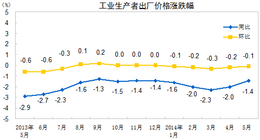 2014年5月份,全國(guó)工業(yè)生產(chǎn)者出廠價(jià)格同比下降1.4%,環(huán)比下降0.1%。工業(yè)生產(chǎn)者購(gòu)進(jìn)價(jià)格同比下降1.8%,環(huán)比下降0.1%。1-5月平均,工業(yè)生產(chǎn)者出廠價(jià)格同比下降1.9%,工業(yè)生產(chǎn)者購(gòu)進(jìn)價(jià)格同比下降2.1%。
