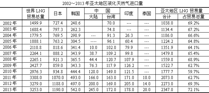 亞洲是世界上最大的LNG(液化天然氣)市場(chǎng),一直占有世界LNG貿(mào)易量的最大份額,2013年亞洲占有LNG貿(mào)易總量的72.1%,又創(chuàng)新高。2011年3月福島核電站泄漏事故發(fā)生后,日本公共事業(yè)公司大量進(jìn)口LNG等化石燃料,推動(dòng)了LNG消費(fèi)。盡管日本試圖重啟核能發(fā)電,有可能減少LNG供應(yīng),但由于亞洲國(guó)家的經(jīng)濟(jì)發(fā)展對(duì)能源的需求,另外中國(guó)大陸和韓國(guó)對(duì)LNG的需求,仍然刺激亞洲LNG的增加。LNG貿(mào)易仍然是世界上發(fā)展得最快的貿(mào)易形式。