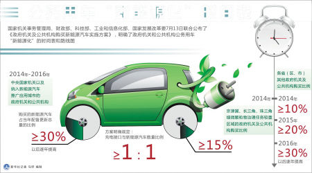 在此基礎上,方案提出,政府機關及公共機構購買機動車輛應當優先選用新能源汽車。同時明確:2014年至2016年,中央國家機關以及納入新能源汽車推廣應用城市的政府機關和公共機構,購買的新能源汽車占當年配備更新總量的比例不低于30%,以后逐年提高。