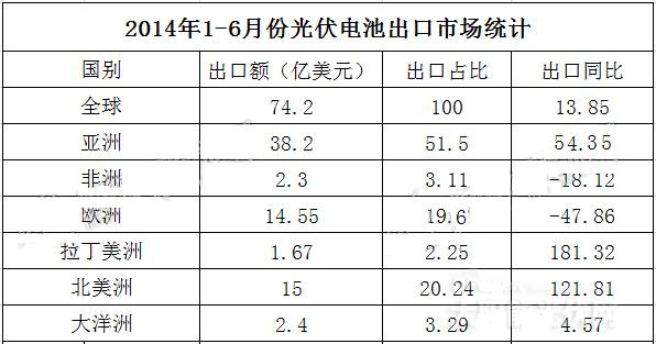 近日,從中國機(jī)電產(chǎn)品進(jìn)出口商會獲悉,2014年1-6月份全球光伏電池出口額為74.2億美元,其中亞洲以38.2億美元居首,北美洲以15億美元位居第二,歐洲則以14.55億美元出口額屈居第三。
