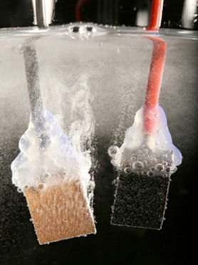 以之前的研究為基礎(chǔ)開發(fā)的催化劑(顯示為氫氧化鎳)是一種頗有前景的催化劑,并且添加鐵可以提升其性能。研究人員在氫氧化鎳中加入鐵,形成分層結(jié)構(gòu),然后將催化劑放在多孔“泡沫”鎳上以擴大反應(yīng)的發(fā)生范圍,從而加快其速度。